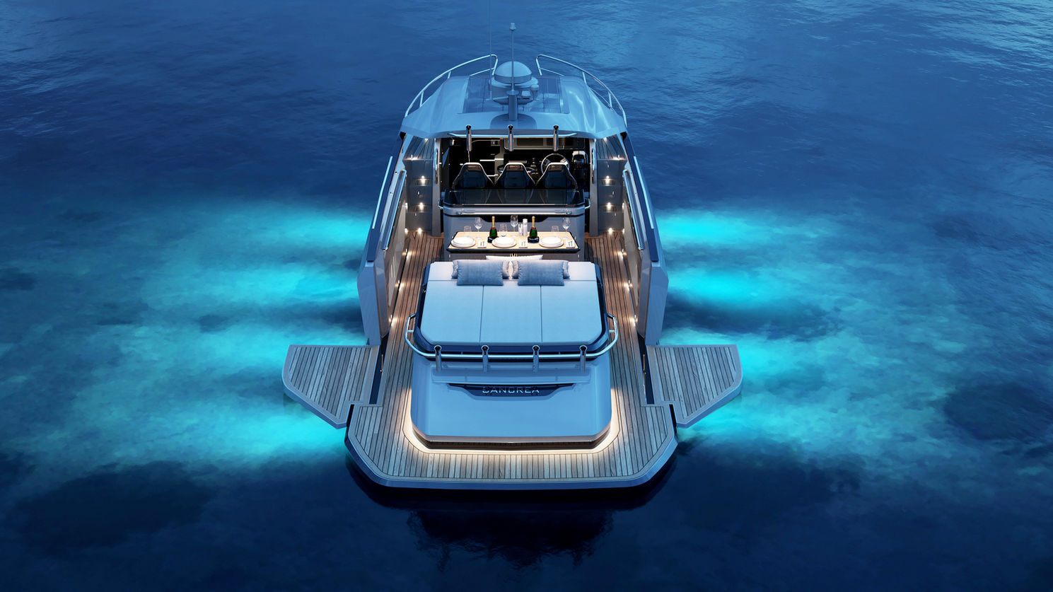 Sancrea 33 is a beautifully designed day boat which provides luxurious, relaxing space throughout the intelligent cockpit layout. Its performance hull is seaworthy, safe and easy to drive. The most notable feature is the versatility of the cockpit. With the sleek and stylish hardtop, stunning opening side balconies and plus hidden outboard engines with the sunpads on the top is a boat that’s just ready for anything.